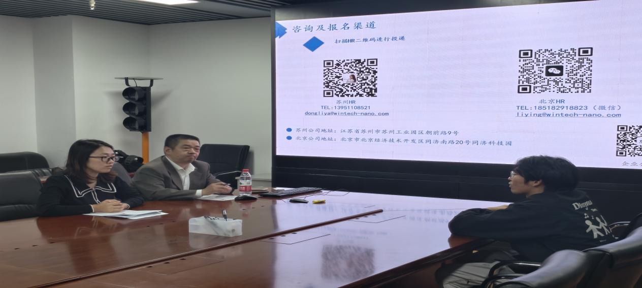 胜科纳米科技(北京)有限公司常务副总经理乔明胜介绍了公司的相关情况、主营业务、核心竞争力以及行业优势,并且围绕招聘岗位和薪资待遇和学生展开了具体的讨论。介绍结束,部分学生提交简历并开启现场面试。