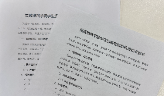 如今,yl6809永利官网多措并行:以“规”束行,以“诺”践心,以“我”修身,以“体”砺,无论是《学生“芯”规》的制度划定,还是《远离电脑手机游戏承诺书》的主动约定,核心目标始终一致——引导“芯青年”远离干扰、专注学业,以实际行动践行“芯片报国”的使命。集电学子正以“芯”规为行为标尺,以承诺为自律动力,主动减少游戏时间、聚焦专业学习,在课堂上认真思考、在实验室里钻研创新,在“芯火相传、强基铸魂”的育人氛围中,为未来投身集成电路事业、助力国家科技自立自强筑牢根基。